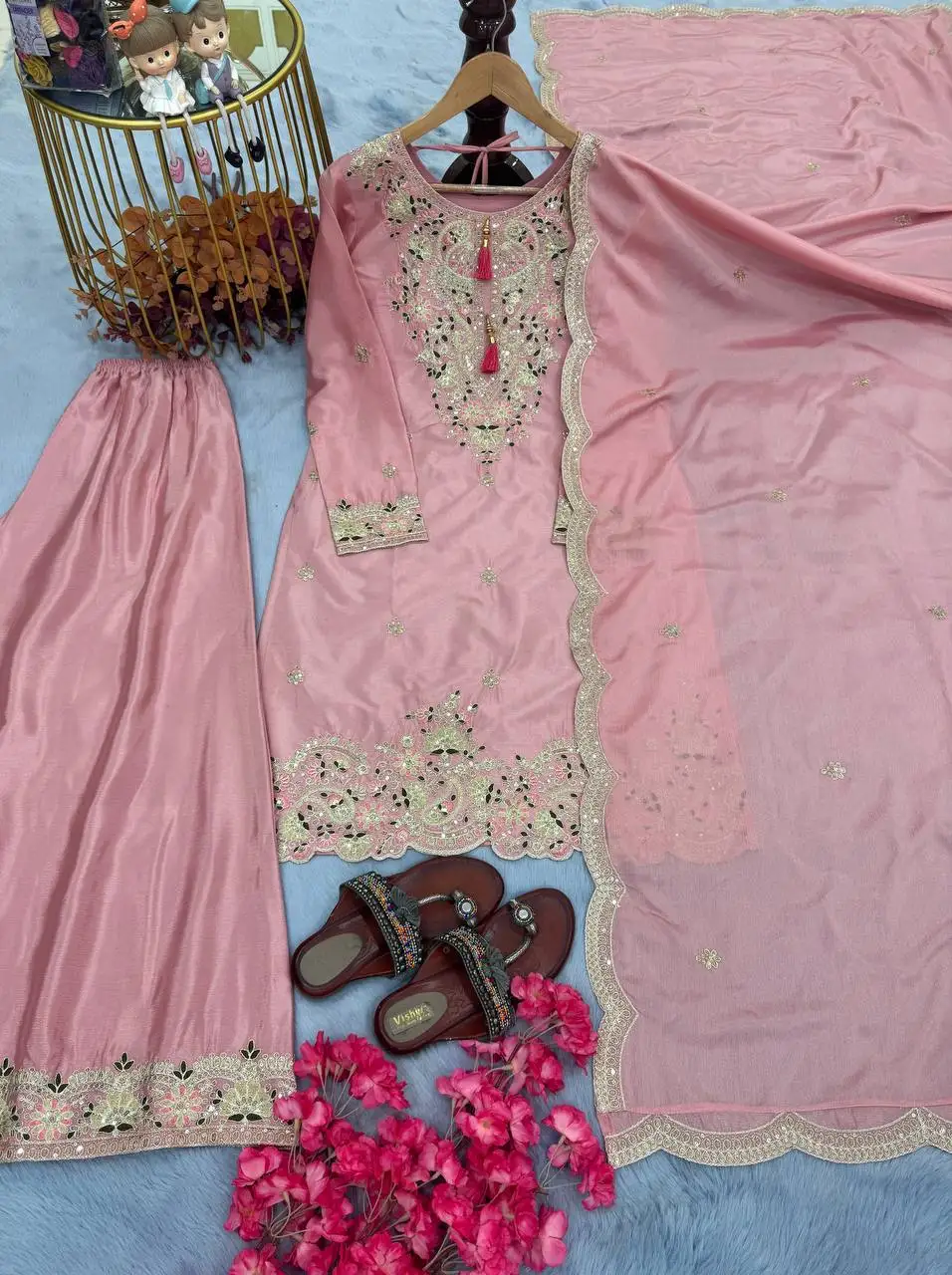 Latest Designer Pure Chinon Silk Top Palazzo Dupatta Set Eco-Friendly Floral Streetwear for Party Wear Natural Waistline